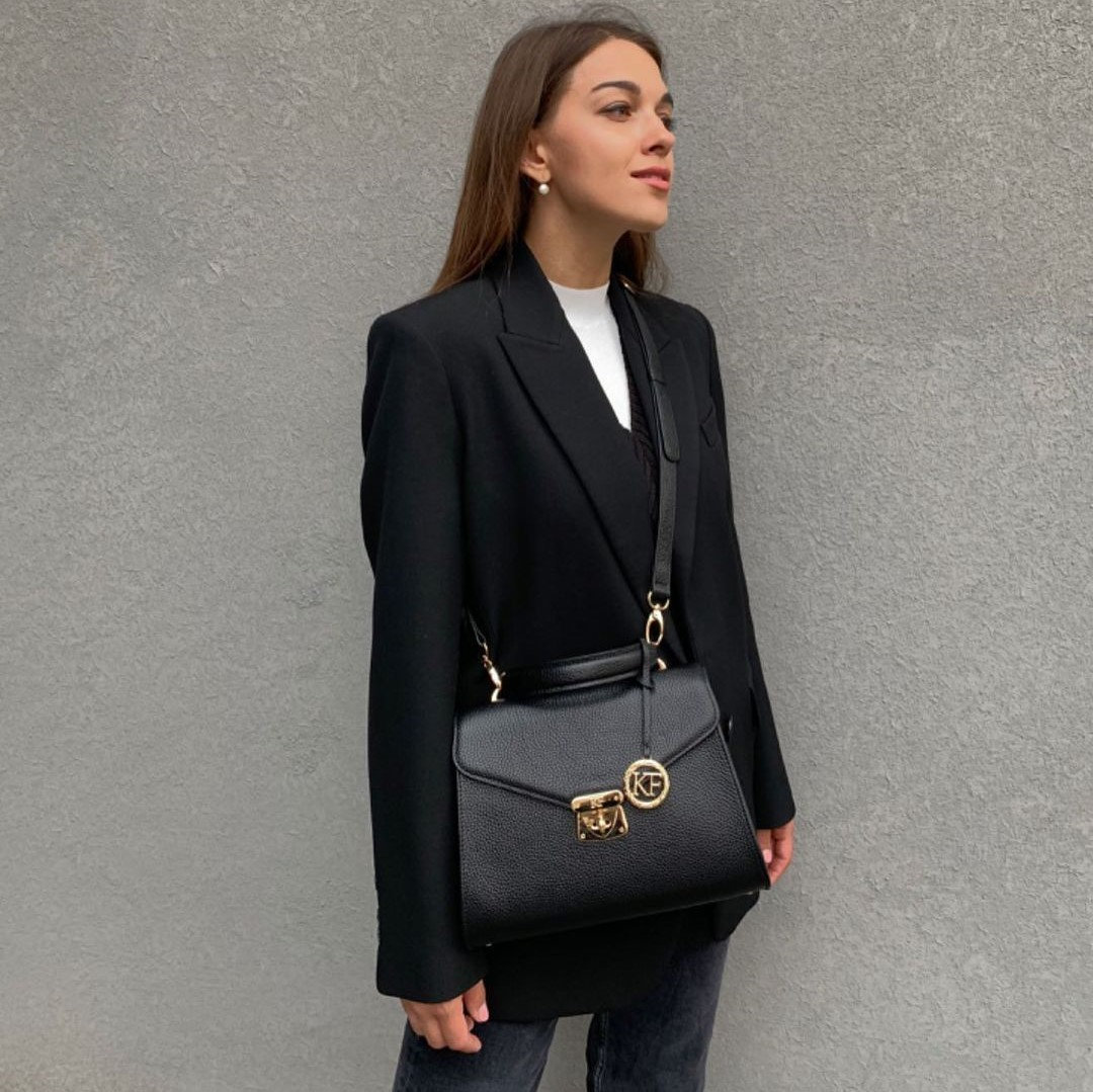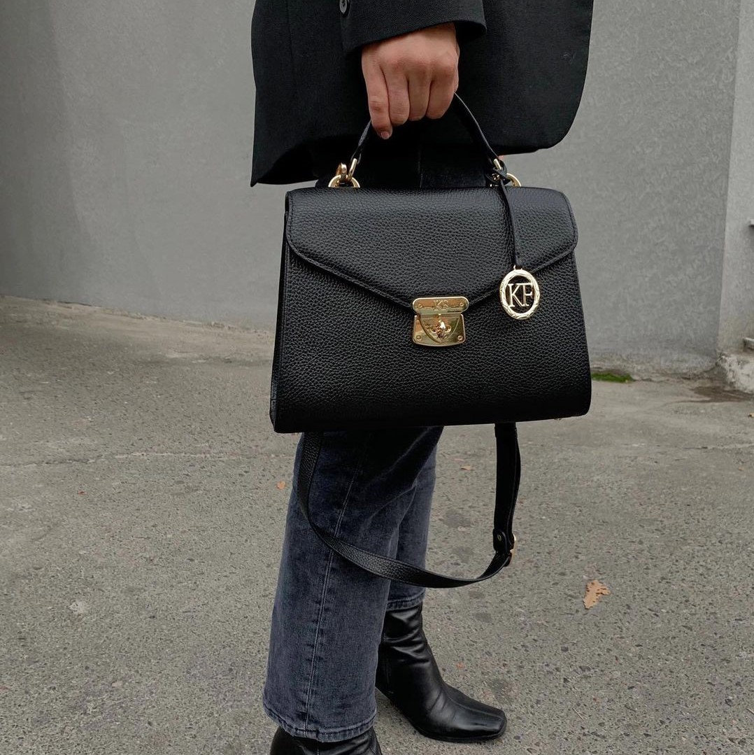 Delivery: In most cases our goods are shipped by FedEx or Ups Express. On rare occasions the goods might be shipped by Ukrposhta. The clients should check in advance an estimate of the amount of customs duty and value added tax. Black genuine leather handbag from ukrainian designer Katerina Fox. This model is designed for women who appreciate the sleek design combined with functionality and comfort. High-quality and reliable hardware ensure long service bags. The internal space of a bag is equipped with one spacious compartment and two patch-pockets and one zipper pocket. The bag is closed with a zipper. The bottom of the bag is protected with metal legs. There is a long handle that allows you to wear the bag on the shoulder. The kit also includes a storage bag.