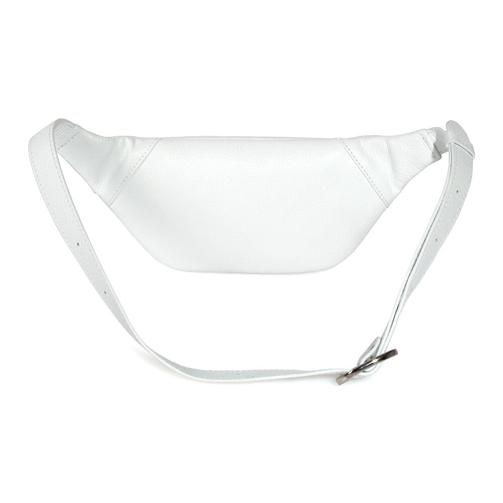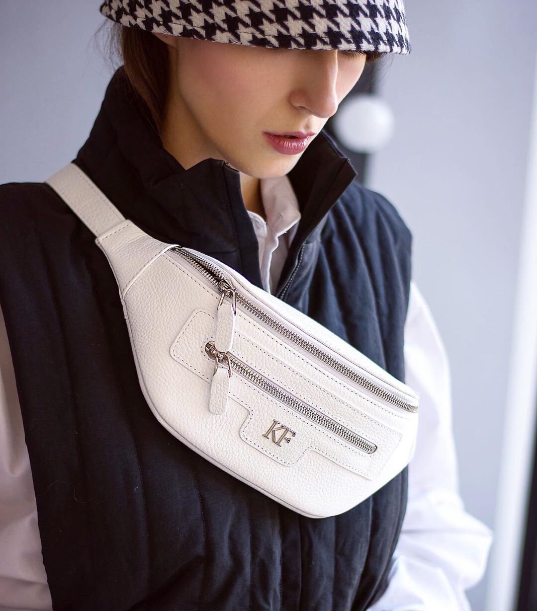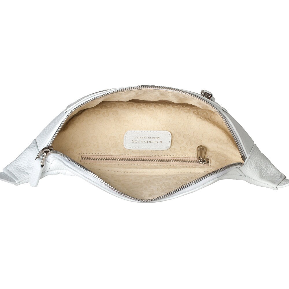 White genuine leather woman bananka bag from ukrainian designer Katerina Fox. Fashionable and elegant modern bag KF for bright girls and women. This bag is able to attract attention and highlight your exquisite taste. Inside the bag is one large compartment and a convenient zippered pocket for small items, closes the bag on the zipper.